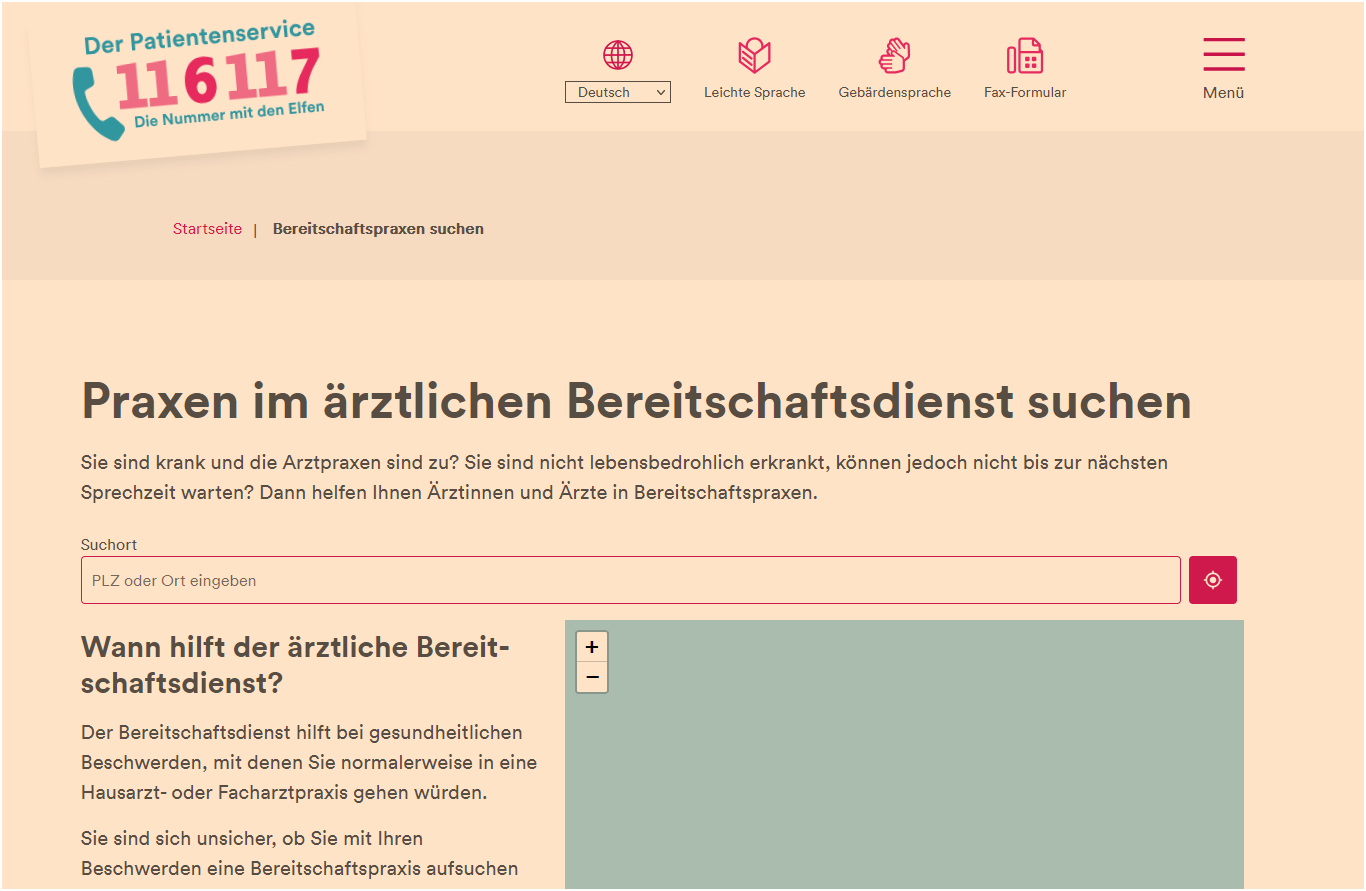 Hier erhalten Sie eine Übersicht der zuständigen Bereitschaftsdienstpraxen, die in der Regel einem Krankenhaus angegliedert sind.